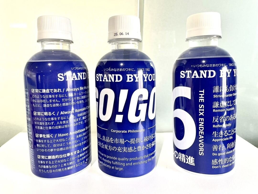 2023年06月27日(火) ワキ製薬のオリジナルウォーターが完成!ご来社時に是非! ゴミの排出や業務効率化のために、ご来社時の飲料の配膳を辞め、来客者にお出しするワキ製薬のオリジナルウォーターを創りました! ラベルは3種類!ワキ製薬のコーポレートカラーである深いブルーに、企業理念やフィロソフィ、そして6つの精進がラベルに記載されています! どのラベルが運ばれてくるか.ご来社いただいた時にご覧ください!