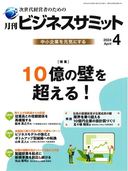 2024年04月01日(月) 月刊ビジネスサミットに掲載 月刊ビジネスサミット4月号の巻頭特集「10億の壁を超える」にて弊社代表である脇本真之介がトップを飾り、4ページにわたるインタビュー記事が掲載されました! 社員との関係づくりや数々の失敗を乗り越えた今までのストーリーを語っております。
