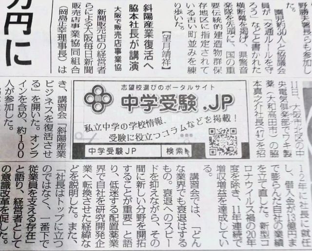 2023年10月20日(金) 毎日新聞に記事が掲載されました! 10月11日に講演させていただきました記事が新聞にて掲載されました 斜陽産業である新聞業界と配置薬の業界を例に出して、これからどういう経営が必要なのか?などを講演しております