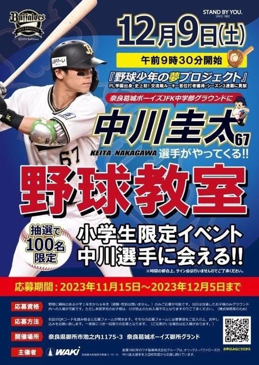 2023年12月09日(土) 野球教室の開催 4年ぶりに開催の野球教室! オリックスバッファローズ3連覇に貢献した中川圭太選手をお招きしました。 近畿在住の小学生を対象に抽選で100名をご招待し大盛況でした! 皆様ご応募いただきありがとうございました